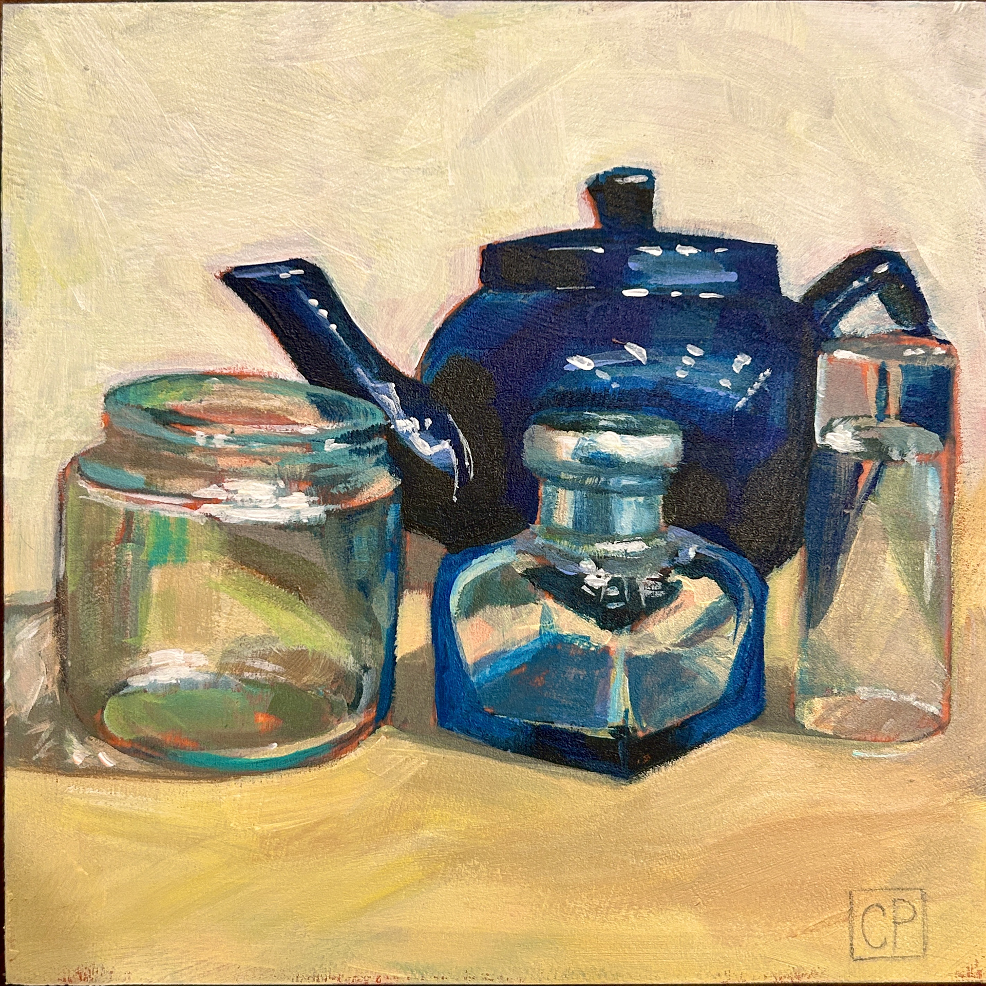 "Sill life with blue and green vessels" | acrylic on panel | 6" x 6"