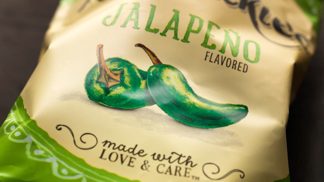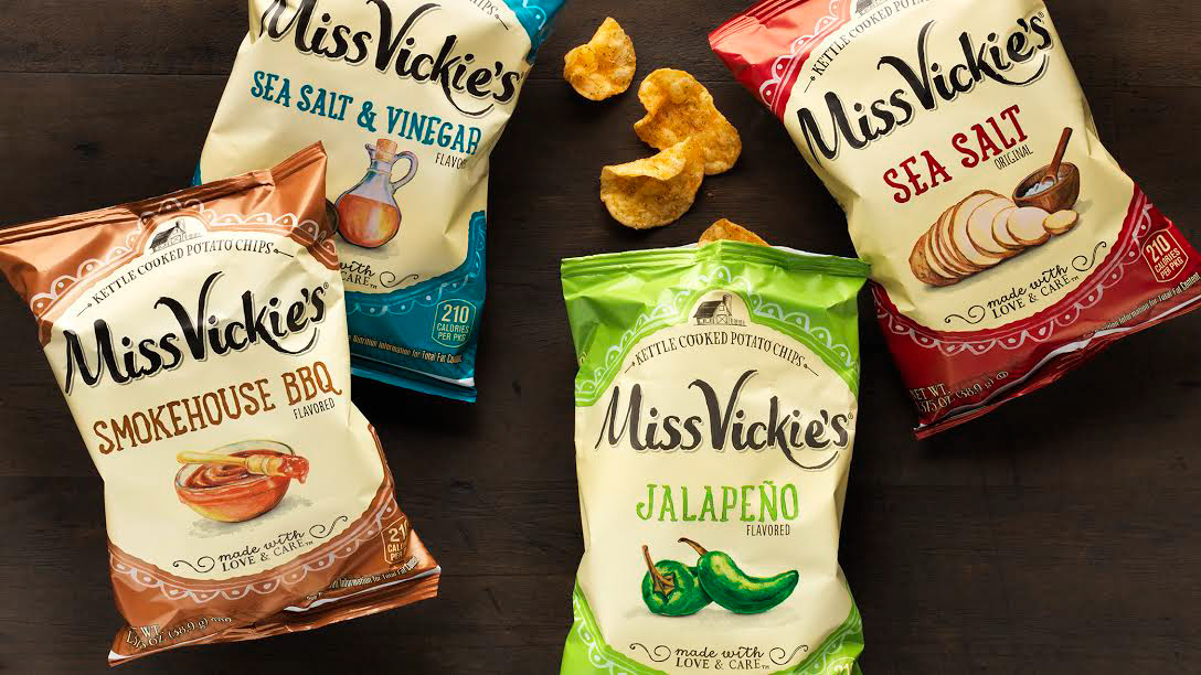 Award winning, hand-painted illustrations for Miss Vickie's Kettle Cooked Potato Chips packaging redesign. The artwork gives a fresh from-the-farm roots approach and captures the quirky charm of the 30-year old brand.
